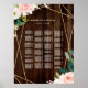 This wedding seating chart features painted watercolor flowers in blush pink, white, and green foliage with a geometric gold frame on a rustic wood print background. For more advanced customisation of this design, please click the Customise Further link to change font, size, and colour. Matching items are also available.