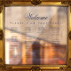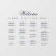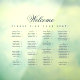 All text is navy blue. The word Welcome is written in an elegant calligraphic script, the rest in caps. The names are ordered alphabetically on 4 columns. Above them and under the word Welcome, there is the message "Please find your seat!".
