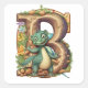 A cheerful green cartoon dragon is playfully wrapped around the letter 'B' that's decorated with leaves and acorns.