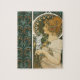 Art nouveau graphic of a woman with feathers and cool designs by Alphonse Mucha. Alphonse Mucha was a Czech-born painter, illustrator and graphic artist, who lived in Paris during the Art Nouveau period. He is best known for his highly stylized and decorative advertising and theatrical posters. He created book illustrations, advertisements, and decorative designs, which are among the best-known images of the period.