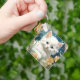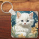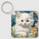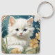 Keychain featuring a kitten in the Art Nouveau style of Alphonse Mucha! A white and fluffy kitten with blue eyes poses with yellow flowers. A cute gift for cat lovers and Art Nouveau collectors!