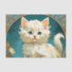 Tissue Paper featuring a white cat in the Art Nouveau style of Alphonse Mucha! A fluffy white cat stares wide eyed at the viewer against a blue backdrop. A great gift for cat lovers and Art Nouveau collectors!