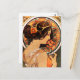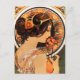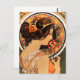 Alphonse Mucha Cow Slip postcard. Lithograph poster. Czech artist Alphonse Mucha created some of the most arresting posters and advertisements of the art nouveau movement. Cow Slip is a beautiful flower allegory featuring a pretty girl with black hair wearing an intricate pink dress. She holds a bouquet of flowers in one hand and the painting is heavily ornamented in typical Mucha fashion. A great gift for fans of Alphonse Mucha, art nouveau, and vintage prints.