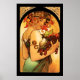 Alphonse Mucha Fruit poster. Lithograph poster from 1897. Czech artist Alphonse Mucha painted a variety of different allegories throughout his career. Fruit depicts a beautiful woman holding an armful of purple grapes, green pears, figs and red apples. The woman’s dark hair is adorned with flowers and leaves, and she wears a light blue art nouveau dress with silver clasps and gold armband. A beautiful gift for fans of Mucha, art nouveau posters, and vintage prints.