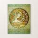 Alphonse Mucha Laurel puzzle. Lithograph poster from 1901. Czech artist Alphonse Mucha was renowned for his allegorical works. Laurel is a painting featuring a beautiful young brunette draped in ivy. She looks onward in profile and wears a yellow rose on her chest. The poster is intricately ornamented with interlocking ivy leaves, tiles and arrows. A great gift for fans of Mucha, art nouveau posters, and vintage prints.