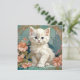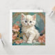 Card featuring a white cat in the style of Alphonse Mucha! This blue eyed fluffy kitten poses with pink flowers and blue blankets. A fabulous gift for cat lovers and Art Nouveau collectors!