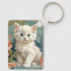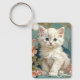 Keychain featuring a white cat in the style of Alphonse Mucha! This blue eyed fluffy kitten poses with pink flowers and blue blankets. A fabulous gift for cat lovers and Art Nouveau collectors!