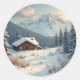 Alpine-inspired winter scene featuring a cosy chalet surrounded by snow-covered trees and majestic mountains. Perfect for rustic decor, seasonal art, and holiday inspiration!