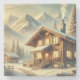 Alpine-inspired winter scene featuring a cosy chalet surrounded by snow-covered trees and majestic mountains. Perfect for rustic decor, seasonal art, and holiday inspiration!