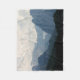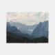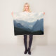 Blanket with a photograph of beautiful mountains, cloudy sky, and rolling hills filled with trees in the foreground. Grey blue colour scheme.