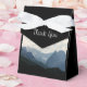 Wedding favour box with a photograph of beautiful mountains, cloudy sky, and rolling hills filled with trees in the foreground. Grey blue colour scheme.