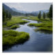 Alpine Valley Stream Green Meadows Snowy Peaks Poster