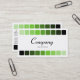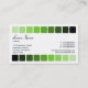 A stylish modern business/profile card template. Edged top and bottom with a row of nine round cornered squares going from a light green to black. Company details on the front with name and contact details on the back.
