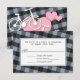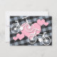 Custom Wedding RSVP reply cards with an alternative design featuring 2 white his & hers bicycles over pink hearts, and placed on a tilted black and blue grey gingham pattern.
