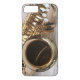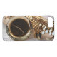 A photo of an alto saxophone resting on top of sheet music. This case is perfect for musicians, music lovers or jazz fans.
