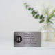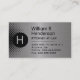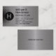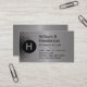 Custom professional business card, with graphics of a brushed aluminium look. Gradient black dots, on the left front of the card ends in a large black circle with a grey single letter monogram. Personalise all the text fields for your business needs.