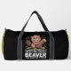 This humourous black and olive green duffle bag features a smiling beaver holding a log, with the clever phrase "ALWAYS BE YOURSELF UNLESS YOU CAN BE A BEAVER THEN ALWAYS BE A BEAVER." It's a fun and lighthearted way to show appreciation for these industrious and adorable animals. Perfect for anyone with a love for beavers or a unique sense of humour. Edit colour of the bag caps and body in the Design tool to your favored colours.