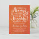 Rustic Thanksgiving party invitation featuring whimsical script and on an orange linen background. This item is available in other background textures and colours.