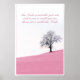 Einzelner Baum auf pinker Wiese mit blauem Himmel.