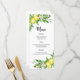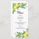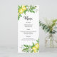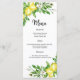 Our Watercolor lemon floral wedding dinner menu card is perfect for an elegant wedding. The modern Mediterranean style design features soft white flowers with green accents accents. This menu can be used for a wedding reception, rehearsal dinner, or any event.
