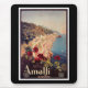 This vintage travel poster if of Amalfi, Italy. It's a scene done from high on a hill overlooking a village and beach below. There are sailboats out in the water. The lower half of the poster is framed with red geraniums.