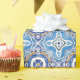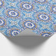 A blue, yellow and green ornamental design on a white background like seen on mediterranean tiles