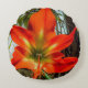 This Round Pillow showcases the intense beauty of a flower, an Amaryllis blooming in the garden. The original photograph by ZoeSPEAK is a closeup, and the details of the flower, the shapes and color changes from the center outward are amazing. From soft shades of green blending into yellow, the bloom finishes with five outstretched petals in deep, rich oranges against a background of green leaves and muted brown wood.