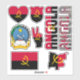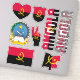 Amazing Angola Shapes National Symbols Sticker. Two country name stickers, one in the colours of the national flag and the other one covered in the Word Cloud with the words "Angola" written in the different alphabet forms and/or languages and fonts. All words are coloured with the national colours used on the flag of Angola, Beautiful heart, shield (escutcheon) and map filled with the representation of the Angola national flag. Hand sticker with the two fingers up, representing victory filled with the colours of the Angola national flag. The last two stickers are national flag of the Angola and the national Coat of Arms. This is the great set of superb stickers with most of them unique and hand drawn. All stickers are fully customisable using "Customise it!" feature. You can mix and match them as you wish. If you want multiple hearts but no shield fire away. Maybe you want only hand with the victory sign? Easy, remove everything else and make multiple copies of the hand. These grand stickers are the perfect sticky gift for any occasion. Fire away and stick them where your heart desire! © 2022 CountriesOfTheWorld