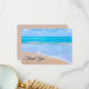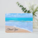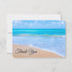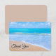 A small sized thank you card with a photograph of a clear blue ocean scene with gentle waves along a seashore and soft brown sand. A blue sky with fluffy clouds off in the distance. Serene tropical idyllic seascape.