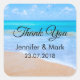Wedding or other event thank you stickers with a photograph of a clear blue ocean scene with gentle waves along a seashore and soft brown sand. A blue sky with fluffy clouds off in the distance. Serene tropical idyllic seascape.