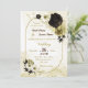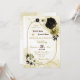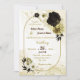 Beautiful botanical wedding invitation featuring brown, ivory white and gold flowers with gold leaves on a gold capsule.