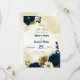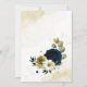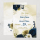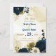 Beautiful navy blue ivory white and gold flowers with gold leaves save the date invitation.
