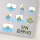 Amazing San Marino Shapes National Symbols Sticker. Two country name stickers, one in the colours of the national flag and the other one covered in the Word Cloud with the words "San Marino" written in the different alphabet forms and/or languages and fonts. All words are coloured with the national colours used on the flag of San Marino, Beautiful heart, shield (escutcheon) and map filled with the representation of the San Marino national flag. Hand sticker with the two fingers up, representing victory filled with the colours of the San Marino national flag. The last two stickers are national flag of the San Marino and the national Coat of Arms. This is the great set of superb stickers with most of them unique and hand drawn. All stickers are fully customisable using "Customise it!" feature. You can mix and match them as you wish. If you want multiple hearts but no shield fire away. Maybe you want only hand with the victory sign? Easy, remove everything else and make multiple copies of the hand. These grand stickers are the perfect sticky gift for any occasion. Fire away and stick them where your heart desire! © 2023 CountriesOfTheWorld
