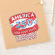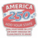 Create your own die-cut America 250 stickers in red, white and blue. Add your state then personalize further with your custom message in red lettering just below the main design. These kiss-cut stickers for the Semiquincentennial are totally unique merchandise for promoting and celebrating the USA's 250th anniversary.