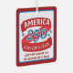 These America 250 metal ornaments make great holiday gifts for family and friends as well as yourself. Personalize with your state or other text on the red ribbon style design and up to two lines below that, printed on both sides. America 250 merchandise is a patriotic way to celebrate 1776 2026 America's 250th anniversary and these red, white and blue square metal Christmas tree ornaments are a fun way to commemorate this historic event. Hang these semiquincentennial ornaments in the holiday tree, from your rear view mirror or display hanging from a bookcase or shelf as treasured keepsakes.