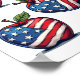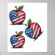 An illustration of an apple with the United States flag pattern in full colour. The left side of the apple features white stars on a blue background, while the right side displays red and white stripes. The apple itself should have a smooth, bold outline, with no shadows or gradients, and the stem and leaf should be a natural green. The colours should be vibrant and clear, with a simple and crisp design