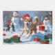 A heartwarming holiday illustration featuring a cheerful dog playing in the snow, wearing a Santa hat and surrounded by colourful gift boxes. In the background, children build a snowman beside a snow-covered Christmas tree, creating a joyful winter wonderland. Perfect for spreading holiday cheer and capturing the magic of Christmas.
