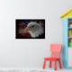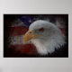 The national bird of the United States of America, the majestic bald eagle against a weatherd and tattered flag background. Great patriotic image.