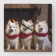 An enchanting scene captures the essence of cosiness and holiday spirit as furry companions adorned in Santa Claus hats gather around a crackling fireplace. The warmth emanating from the hearth creates a snug atmosphere for these adorable canines, while festive stockings hang in the background, enhancing the merry ambiance. The charming illustration portrays a timeless image of companionship and festive joy, perfect for celebrating the holiday season with a touch of canine charm.