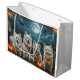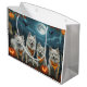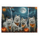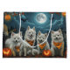 Unleash the spooky spirit with this eerie Halloween design featuring a pack of dogs under a dark, moonlit sky, surrounded by flying bats and glowing pumpkins. Perfect for those who love a touch of frightful fun with their furry friends!