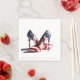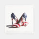 High-heeled shoes with a design inspired by the American flag are positioned against a plain white background