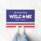 Fourth of July welcome doormat with your family name and year established with WELCOME in white varsity letters and a star replacing the o against a blue background above red and white stripes.