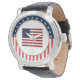 Lovely American flag patriotic military theme wrist watch. These watches feature an artistic illustration an American flag in the centre and a stars and striped border edging! Select from the drop down on this page your favourite style of watch and band from leather, stainless steel, two tone and glitter! Choose from the same drop down for adult or child styles! This watch will surely add some patriotic pride and support to your daily style and look! A wonderful gift for family, friends, family of a military soldier, or someone who is serving in the military or is a vet! For more patriotic cards, home decor, and gift items please visit our shop!