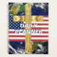 Patriotic Daily Planner with the American Flag in front of an image of the earth, and a gold colour cross on top of the flag. Back of the Daily planner has room for 4 photos to be downloaded. From HAMbyWhiteGlove.