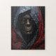 The image depicts a close-up portrait of a person resembling a ghoul or zombie with a dark, almost skeletal face, covered in a network of thin, golden lines. Their eyes are wide and intense, staring directly at the viewer. The figure is shrouded in a hooded cloak made of an aged and tattered American flag with the red and white stripes visible around their neck and shoulders. Image is a post-apocalyptic or dystopian feel.