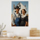 The design presents an iconic rural portrait of a stoic farming duo standing before a Gothic-style farmhouse window, their solemn expressions capturing the essence of countryside resilience. The oil-on-canvas rendering emphasises crisp lines and muted earth tones, highlighting the simplicity of a floral-patterned dress beside sturdy denim overalls. Rich textures of weathered wood siding and subtle wallpaper glimpsed through the window create an immersive Midwestern farmhouse setting. This composition evokes timeless Americana and folk art imagery that resonates with admirers of vintage rustic elegance.