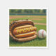 A hot dog with the word "AMERICA" written in mustard rests in a baseball glove on a sports field with a baseball nearby