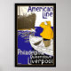 Vintage travel poster for American Line with an ocean liner bound for Philadelphia, Queenstown and Liverpool. Sailor in a small boat looking on as the liner passes by.