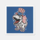American Patriotic Dinosaur, a captivating and vibrant illustration of a cartoonish, vector art-style design of ferocious dinosaur with a cute playful demeanour. The dinosaur is depicted with its mouth wide open to reveal its teeth cute for kids. Perched atop its head is an amusingly patriotic top hat adorned with the stars and stripes of the American flag. The dinosaur itself is rendered in striking white, contrasting sharply with the black background. The hat, featuring red and white stripes with white stars on a blue field, adds an unexpected and whimsical patriotic touch. The illustrated figure and hat are defined by bold outlines that draw the viewer's attention, creating a playful yet animated atmosphere. The unique combination of elements in this design results in a humourous and lively image that is sure to delight viewers.
