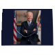 The photograph captures a moment in time before president elect Joe Biden appointed office of Vice President of the United States. Sunlight streams through a window, casting a warm glow on the figure of an Biden standing confidently in the center of the frame. His arms are crossed, a gesture that suggests both authority and a hint of casual ease. --- Mr. Biden is dressed impeccably in a dark suit, the crisp fabric contrasting sharply with the clean lines of his white shirt. A blue and white striped tie adds a touch of personality to the ensemble. --- A glimpse of patriotism is evident in the background. An American flag stands proudly on a pole to the man's right, its vibrant colors a subtle counterpoint to the cool blue of the wall behind him. A closer look reveals a painting hanging on the wall, adding a touch of personal flair to the professional atmosphere. --- Soon to be Vice President Biden is the focal point of the image. His short white hair frames a kind face, etched with the lines of a life well-lived. A warm smile plays on his lips, conveying a sense of confidence, wisdom, and perhaps a hint of amusement.